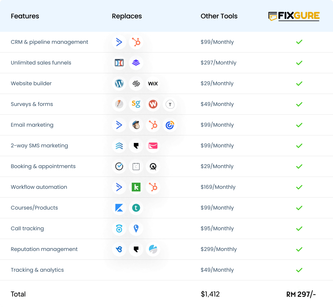 Use 1 platform (FixGure Growth System) to manage your entire business effortlessly with a fraction of the cost.